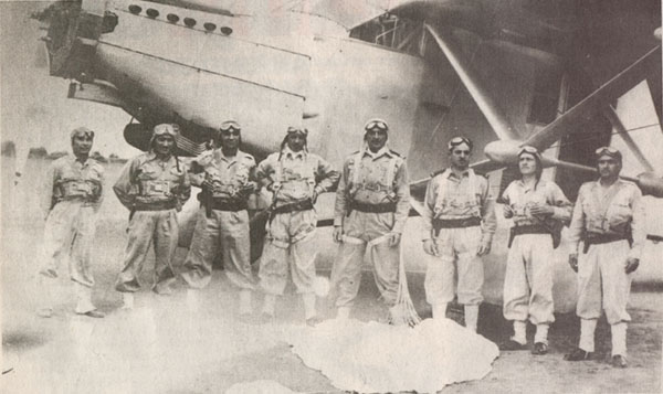 Grupo de paracaidistas de la base aérea de Chiclayo que ejecutaron el primer salto grupal de exhibición en 1940. El avión peruano es un Caproni Ca.111 conocido por "Pancho". De izquierda a derecha: Néstor Madalengoitia, Antonio Brandáriz, Ricardo Colmenares, Luis Alferano, el capitán David Roca, el alférez José Quiñones, Carlos Raffo y Oscar Alamo. Dos de ellos serían los elegidos para tomar por asalto aéreo Puerto Bolívar.